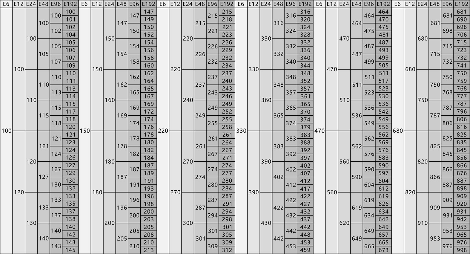 對于E6,E12,E24,E48,E96,E192六大系列來說,其阻值公比依次為 6√10,12√10,24√10,96√10,192√10 對應(yīng)精度分別為±20%,±10%,±5%,±2%,±1%,±0.5%。